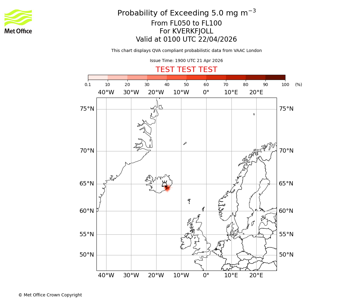 Probability of exceeding 5.0 milligrams per metre cubed. From 000 to 050 for KVERKFJOLL. Valid at 0100 UTC 22/04/2026