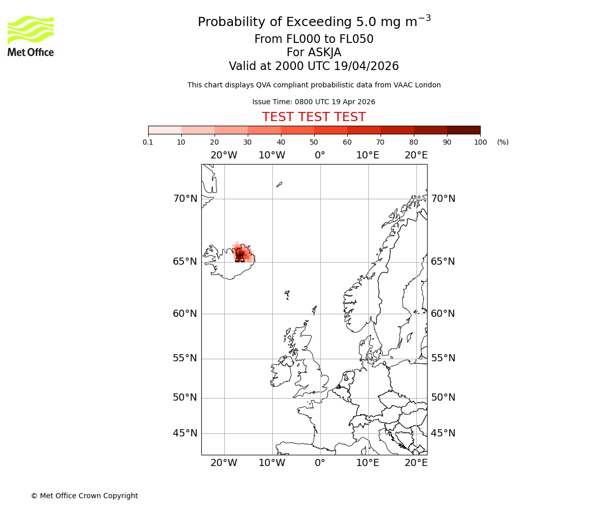 Modelled ash concentration from 000 to 050 for ASKJA. Valid at 0800 UTC 19/04/2026