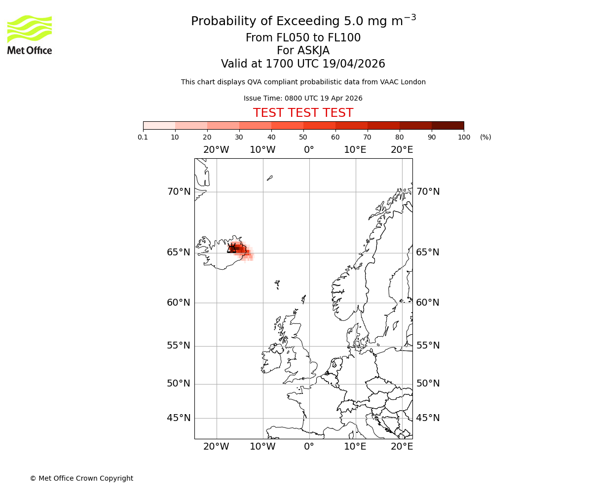 Probability of exceeding 5.0 milligrams per metre cubed. From 000 to 050 for ASKJA. Valid at 1700 UTC 19/04/2026