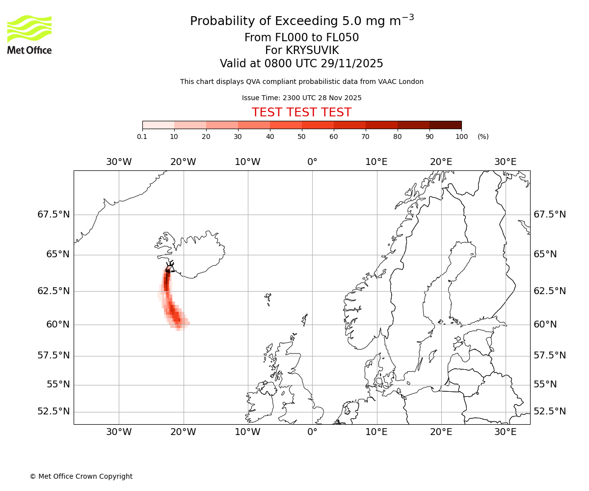 Quantitative Volcanic Ash charts (QVA) are produced in accordance with International Civil Aviation Organization (ICAO) Annex 3 requirements and are provided as well as the London Volcanic Ash Advisory Graphics (VAG) and Advisories (VAA). The lowest QVA threshold (0.2 mg/m³) matches to the areas depicted in the VAA and VAG. Both expected ash concentration and probabilistic forecast information is provided in the chart viewer below for eruptions occurring in the London Volcanic Ash Advisory Centre (VAAC) area of responsibility.