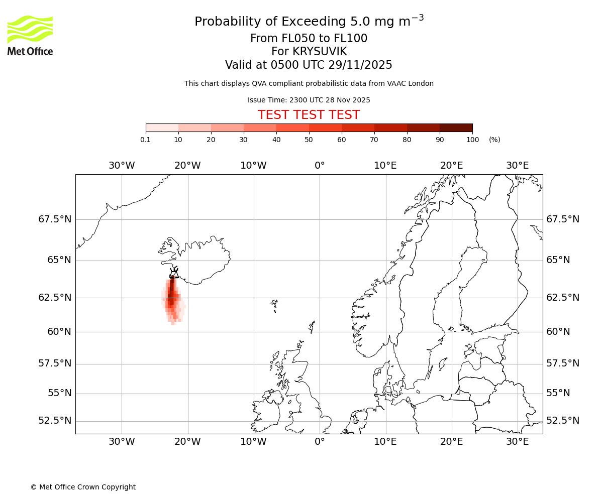 Probability of exceeding 5.0 milligrams per metre cubed. From 000 to 050 for KRYSUVIK. Valid at 0500 UTC 29/11/2025