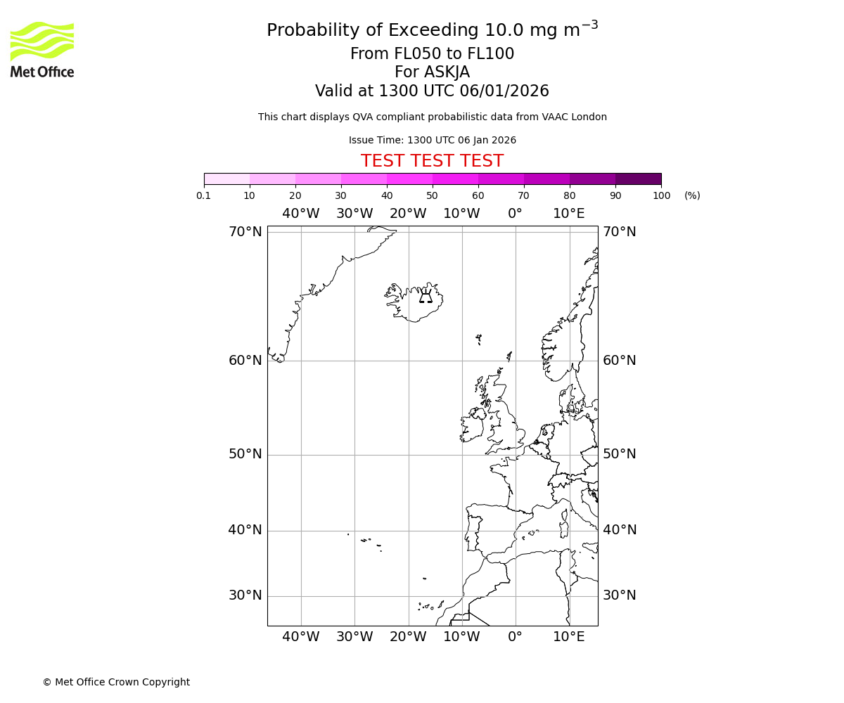 Probability of exceeding 10.0 milligrams per metre cubed. From 000 to 050 for ASKJA. Valid at 1300 UTC 06/01/2026