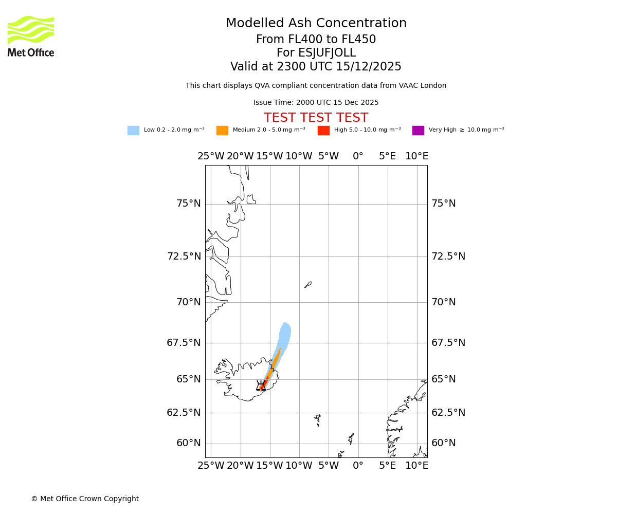 Modelled ash concentration from 400 to 450 for ESJUFJOLL. Valid at 2000 UTC 15/12/2025
