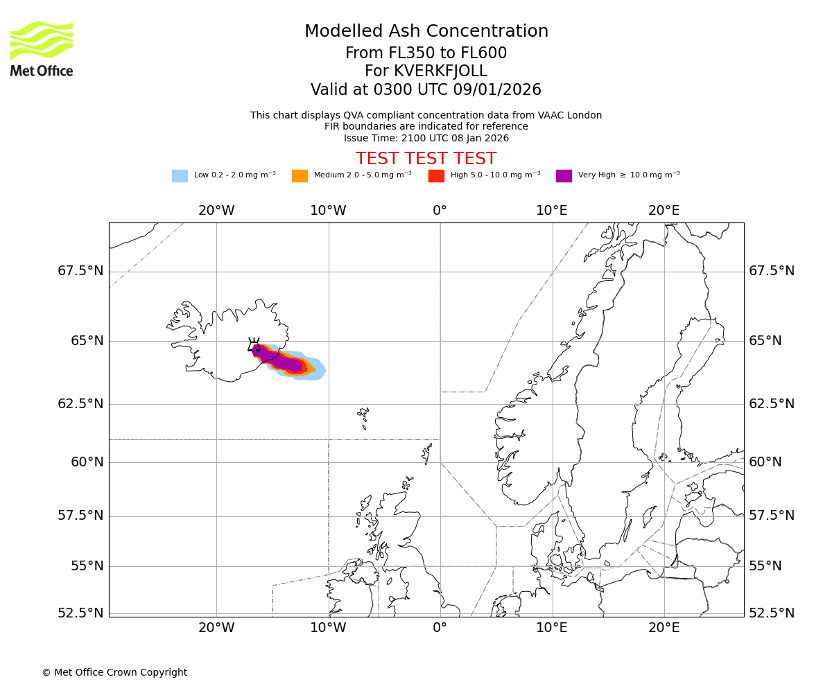 Modelled ash concentration from 350 to 600 for KVERKFJOLL. Valid at 2100 UTC 08/01/2026