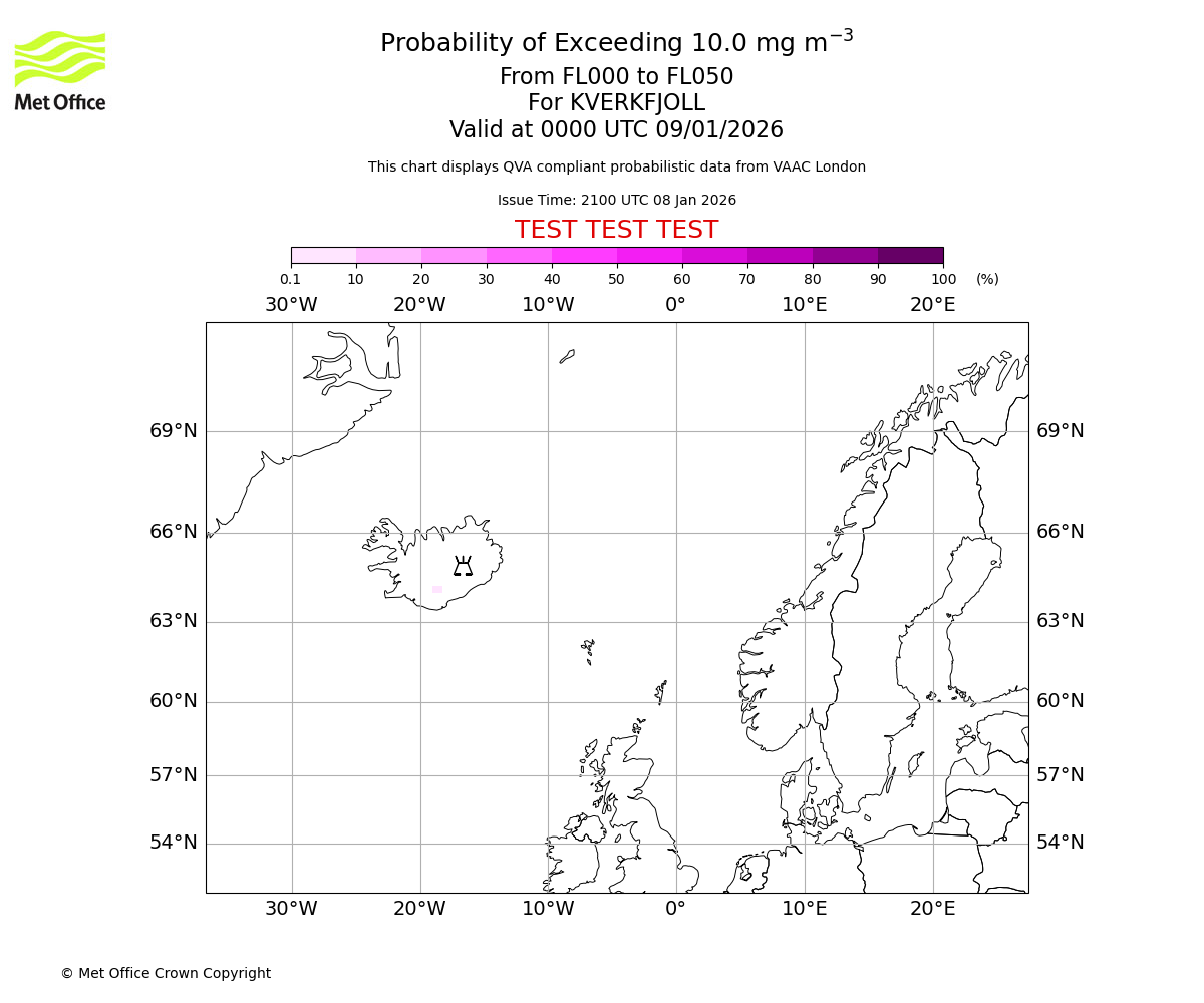 Modelled ash concentration from 000 to 050 for KVERKFJOLL. Valid at 2100 UTC 08/01/2026