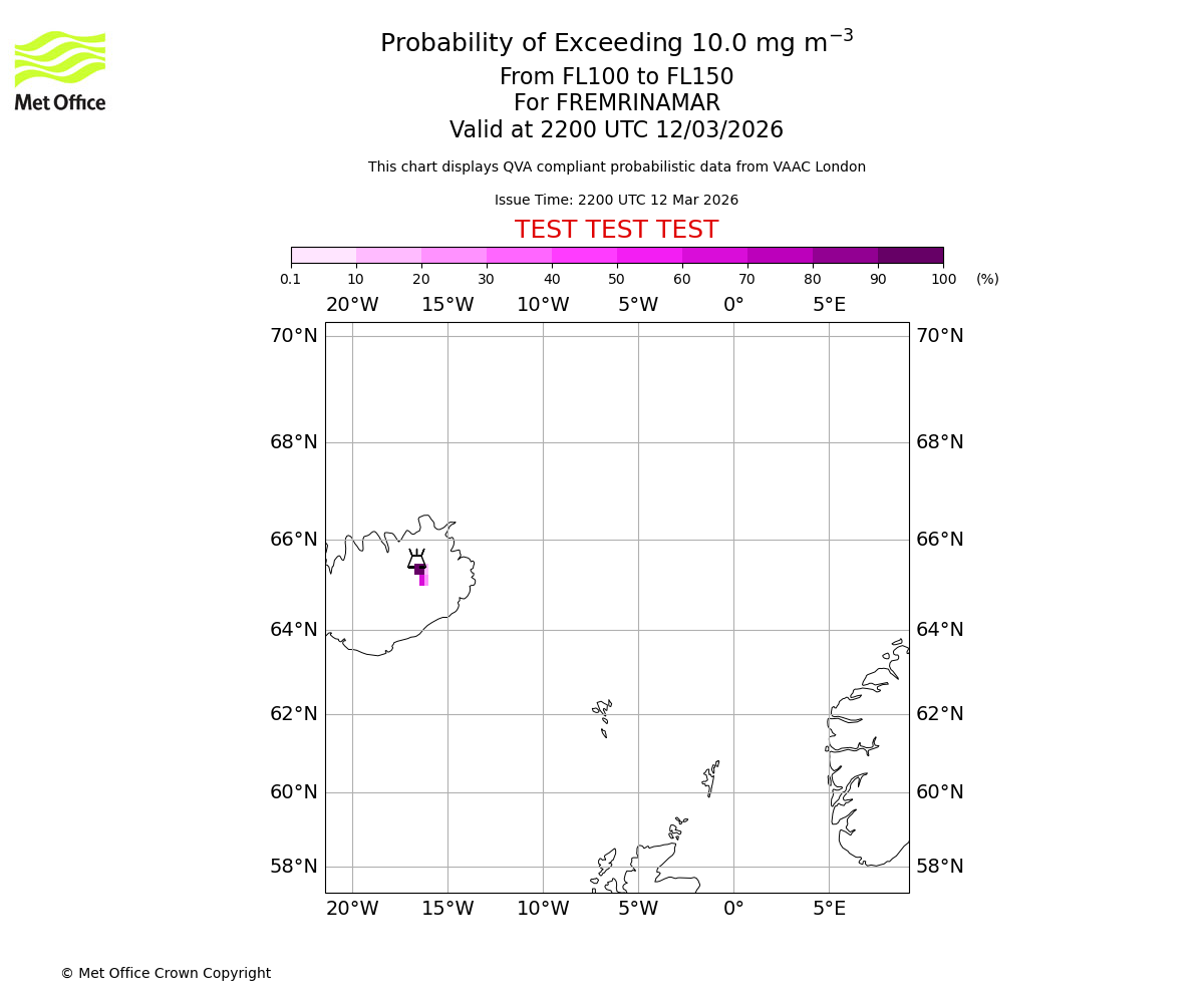Modelled ash concentration from 000 to 200 for FREMRINAMAR. Valid at 2200 UTC 12/03/2026