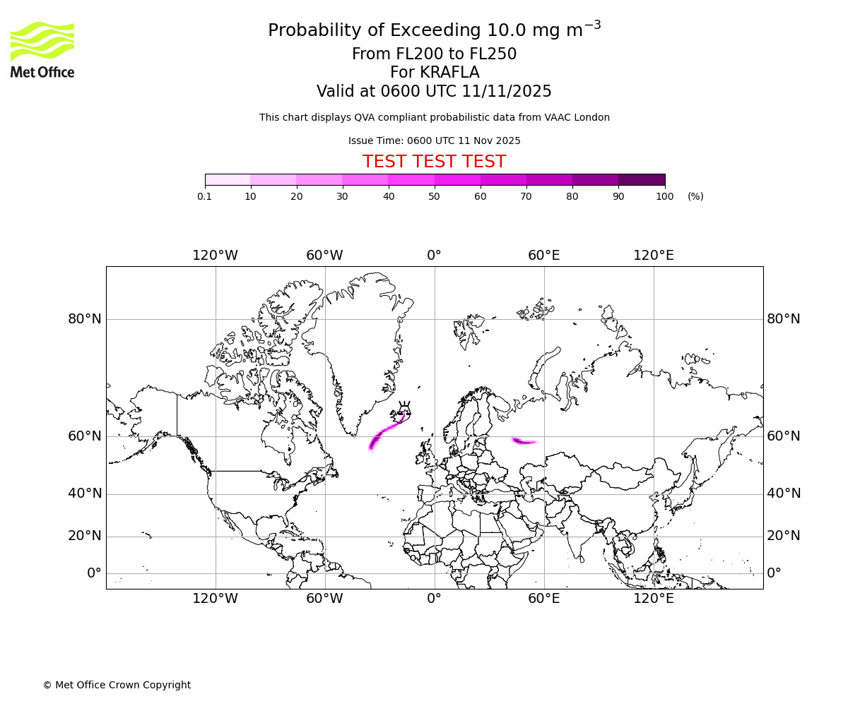 In accordance with ICAO Annex 3, Amendment 82 VAAC London will provide operational QVA forecasts from 27 November 2025 and these will be made available via a VAAC London QVA API information service. These charts are currently provided for test and evaluation purposes (not for operational use) until the introduction of the operational service.