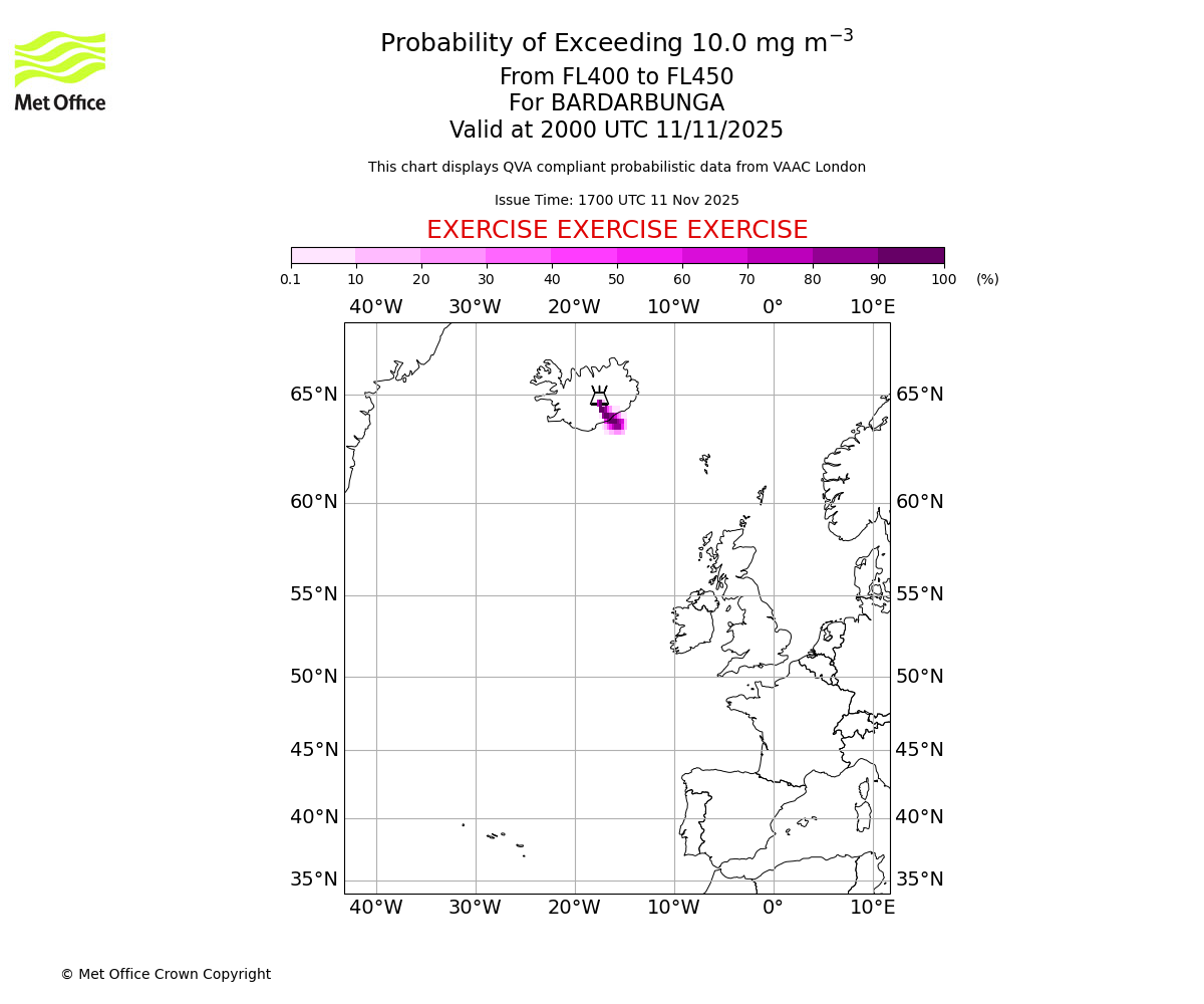 Probability of exceeding 10.0 milligrams per metre cubed. From 400 to 450 for BARDARBUNGA. Valid at 1700 UTC 11/11/2025