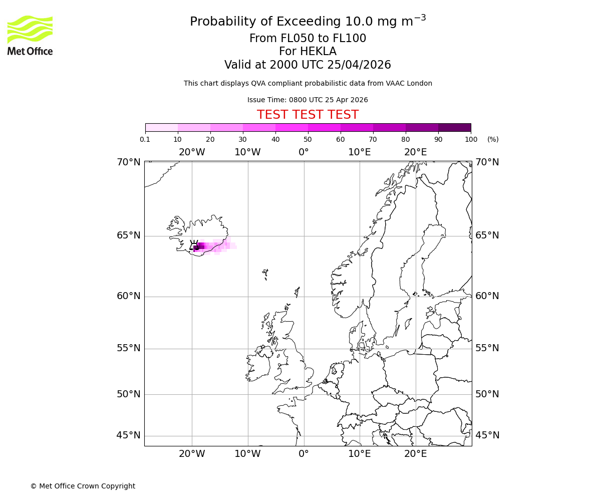 Probability of exceeding 10.0 milligrams per metre cubed. From 000 to 050 for HEKLA. Valid at 2000 UTC 25/04/2026