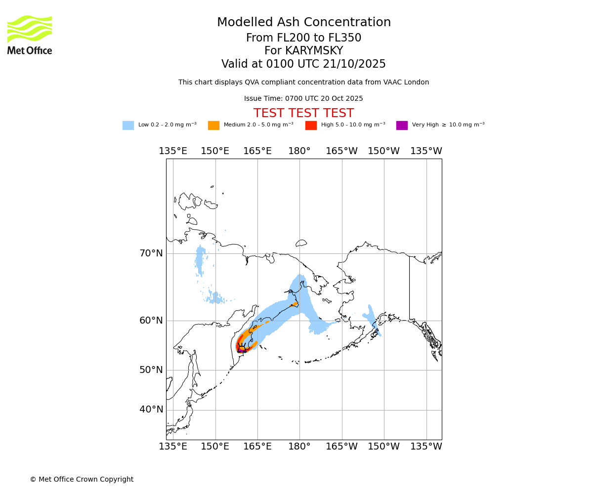 Modelled ash concentration from 000 to 200 for KARYMSKY. Valid at 0100 UTC 21/10/2025