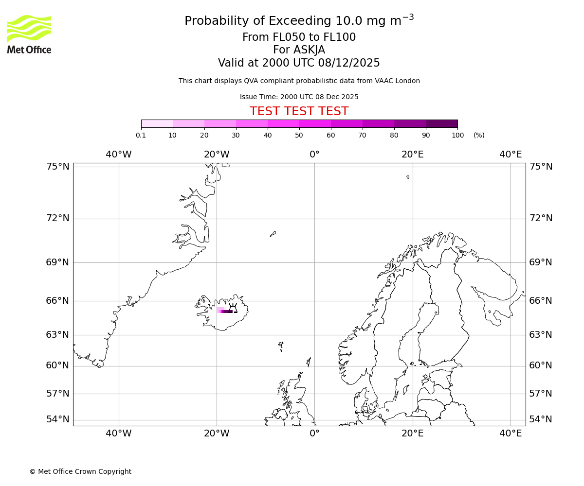 Probability of exceeding 10.0 milligrams per metre cubed. From 000 to 050 for ASKJA. Valid at 2000 UTC 08/12/2025