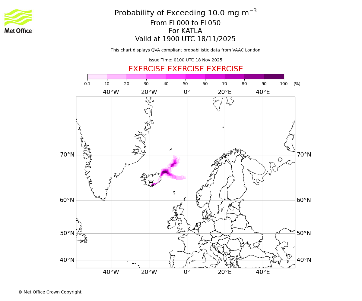 Modelled ash concentration from 000 to 050 for KATLA. Valid at 0100 UTC 18/11/2025