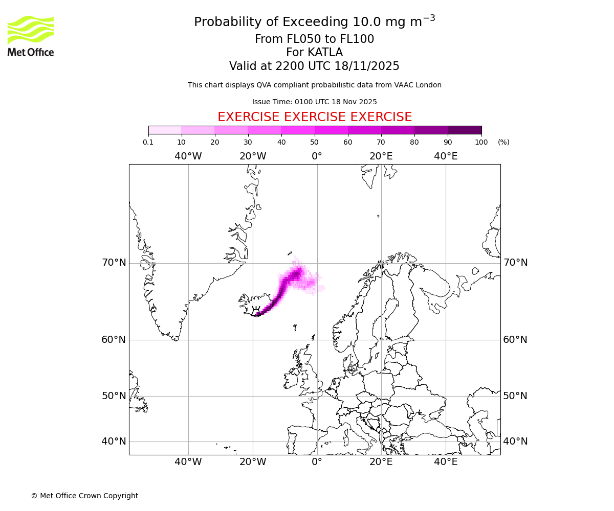 Probability of exceeding 10.0 milligrams per metre cubed. From 000 to 050 for KATLA. Valid at 2200 UTC 18/11/2025