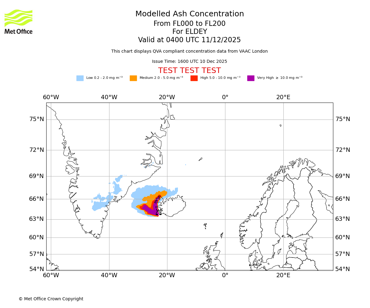 Modelled ash concentration from 000 to 050 for ELDEY. Valid at 1600 UTC 10/12/2025
