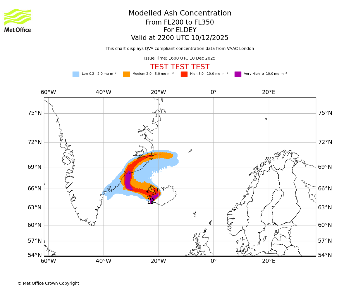 Modelled ash concentration from 000 to 200 for ELDEY. Valid at 2200 UTC 10/12/2025