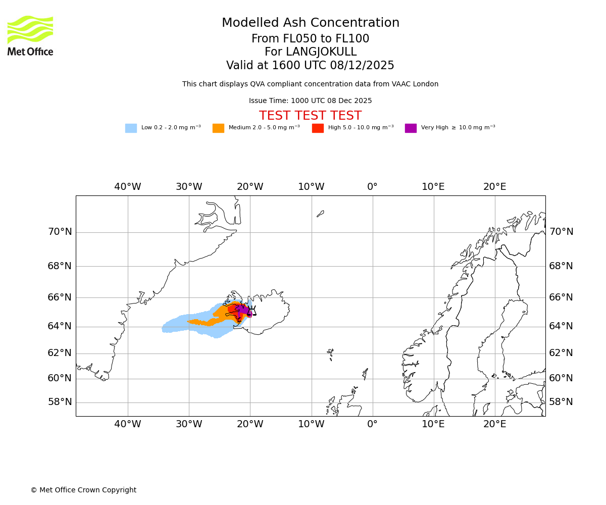 Modelled ash concentration from 000 to 050 for LANGJOKULL. Valid at 1600 UTC 08/12/2025