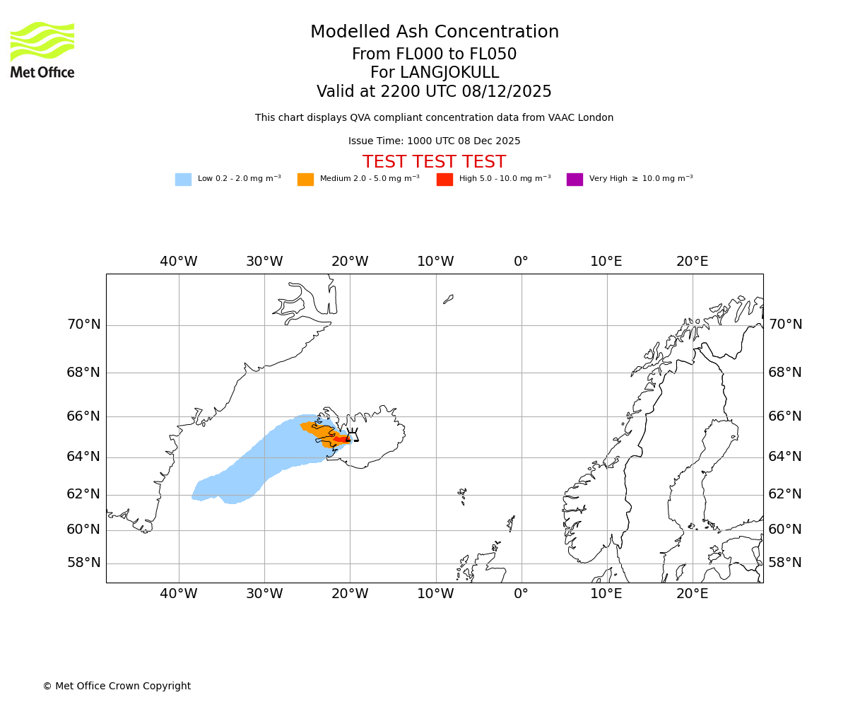 Modelled ash concentration from 000 to 200 for LANGJOKULL. Valid at 1000 UTC 08/12/2025