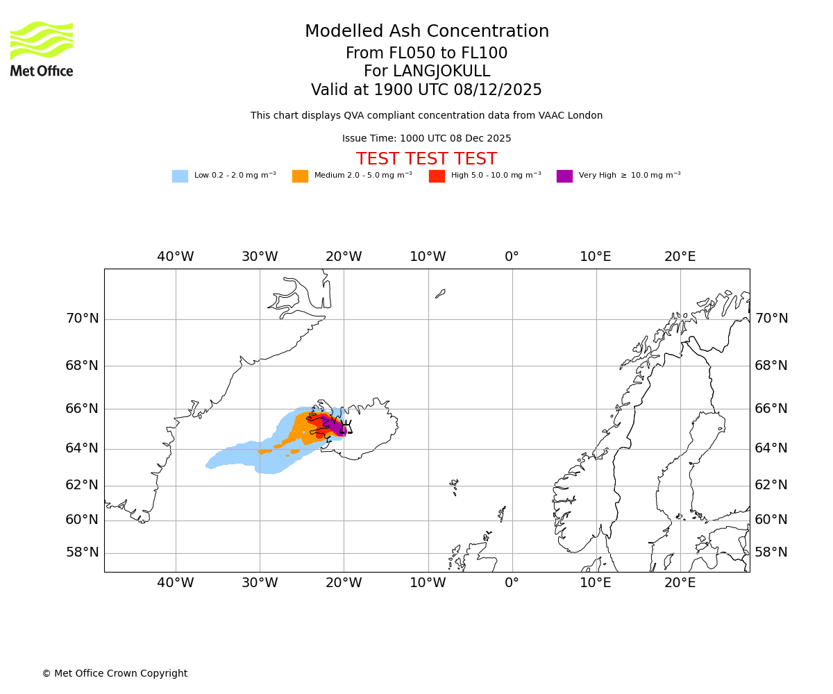 Modelled ash concentration from 000 to 050 for LANGJOKULL. Valid at 1900 UTC 08/12/2025