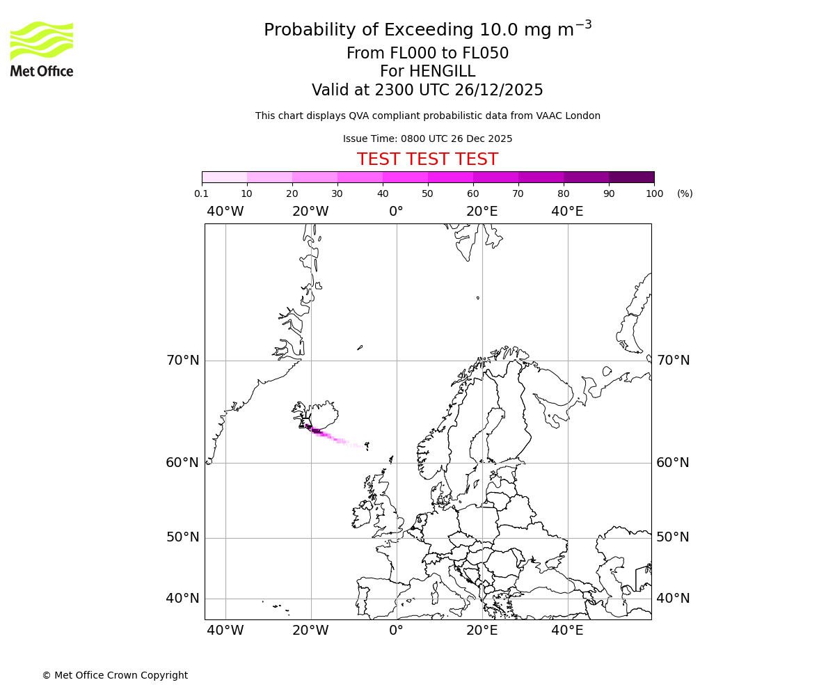 Modelled ash concentration from 000 to 200 for HENGILL. Valid at 0800 UTC 26/12/2025