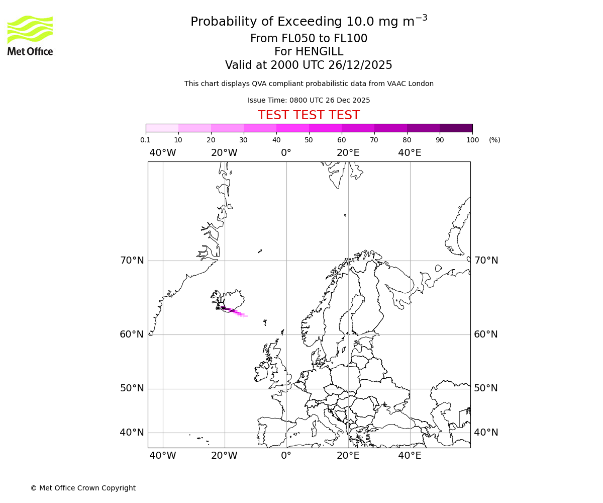 Probability of exceeding 10.0 milligrams per metre cubed. From 000 to 050 for HENGILL. Valid at 2000 UTC 26/12/2025