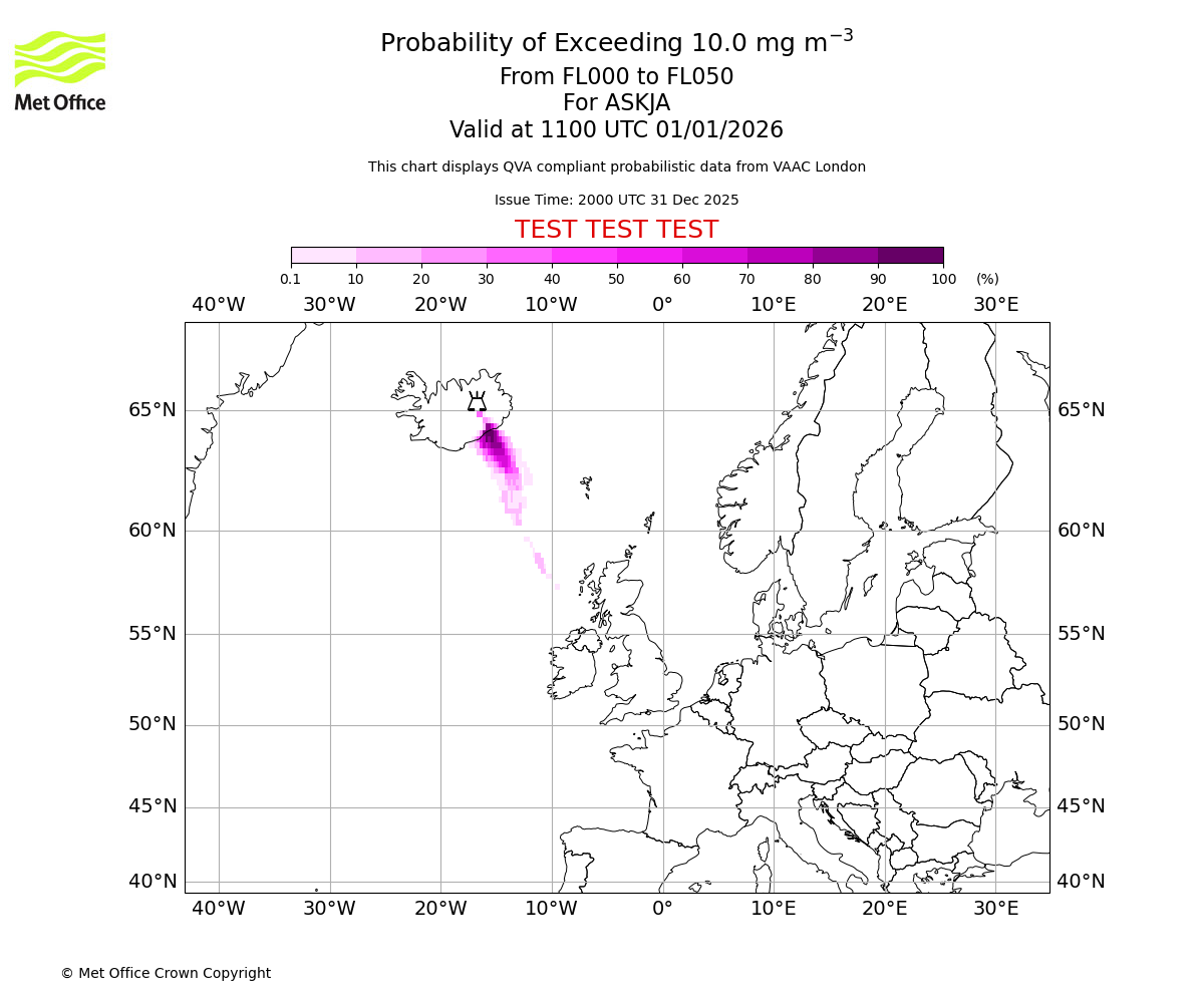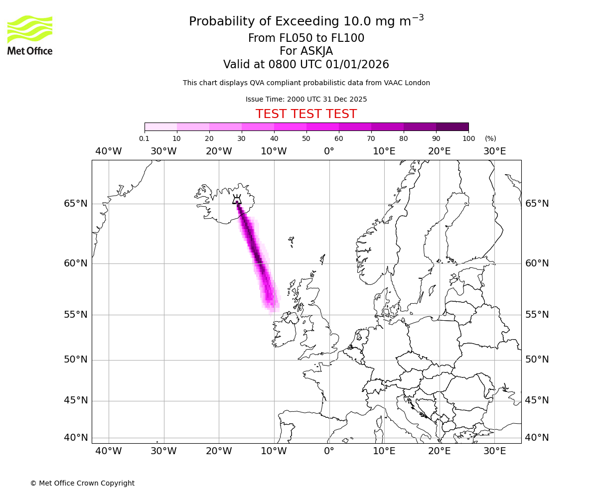Probability of exceeding 10.0 milligrams per metre cubed. From 000 to 050 for ASKJA. Valid at 0800 UTC 01/01/2026
