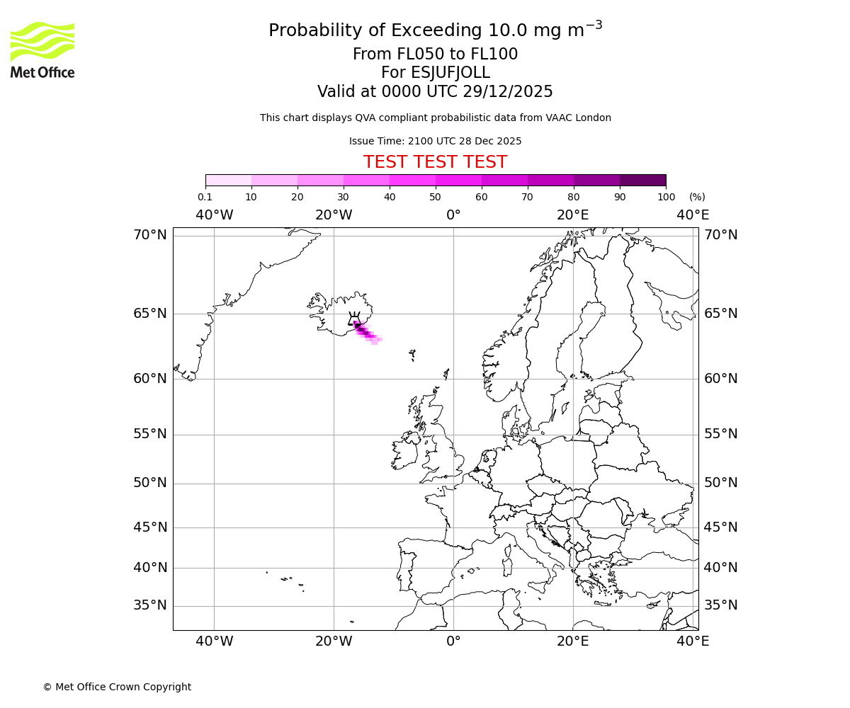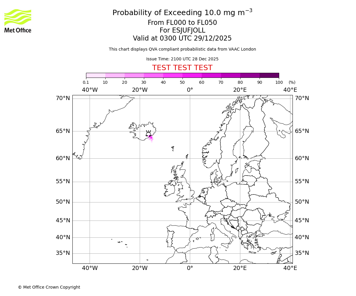Modelled ash concentration from 000 to 050 for ESJUFJOLL. Valid at 2100 UTC 28/12/2025