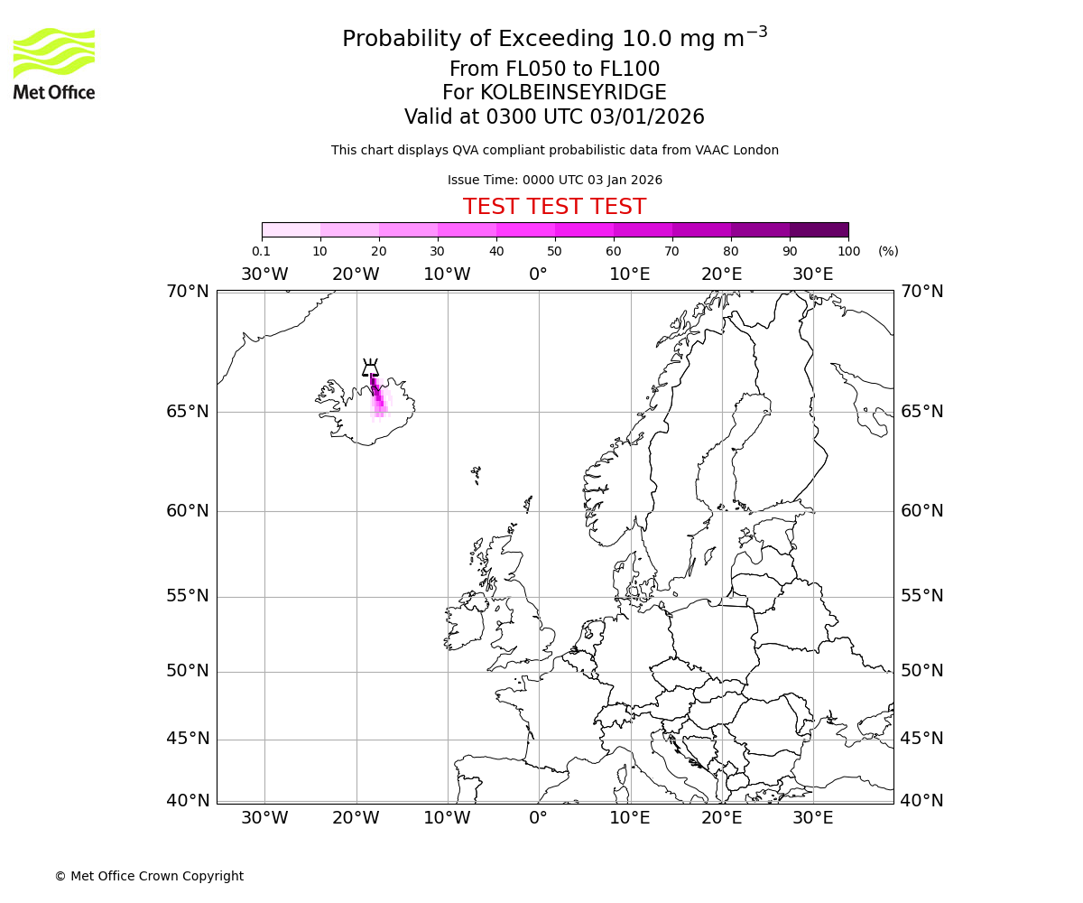 Probability of exceeding 10.0 milligrams per metre cubed. From 000 to 050 for KOLBEINSEYRIDGE. Valid at 0300 UTC 03/01/2026