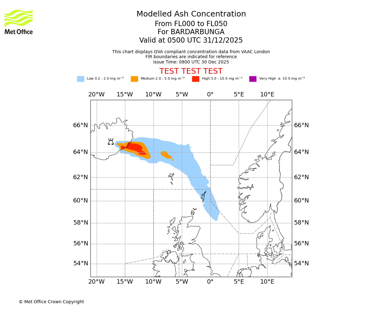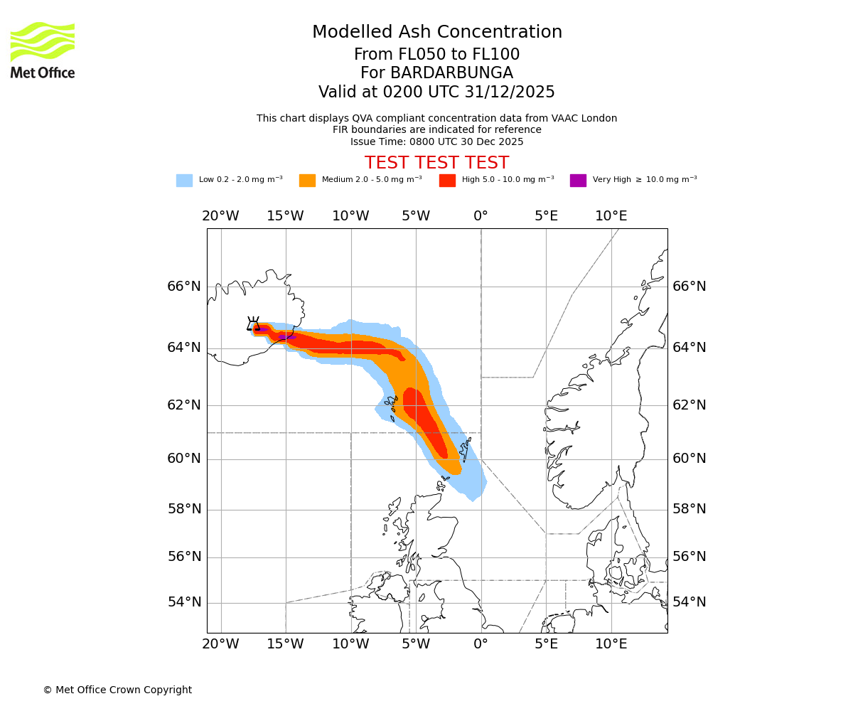 Modelled ash concentration from 000 to 050 for BARDARBUNGA. Valid at 0200 UTC 31/12/2025