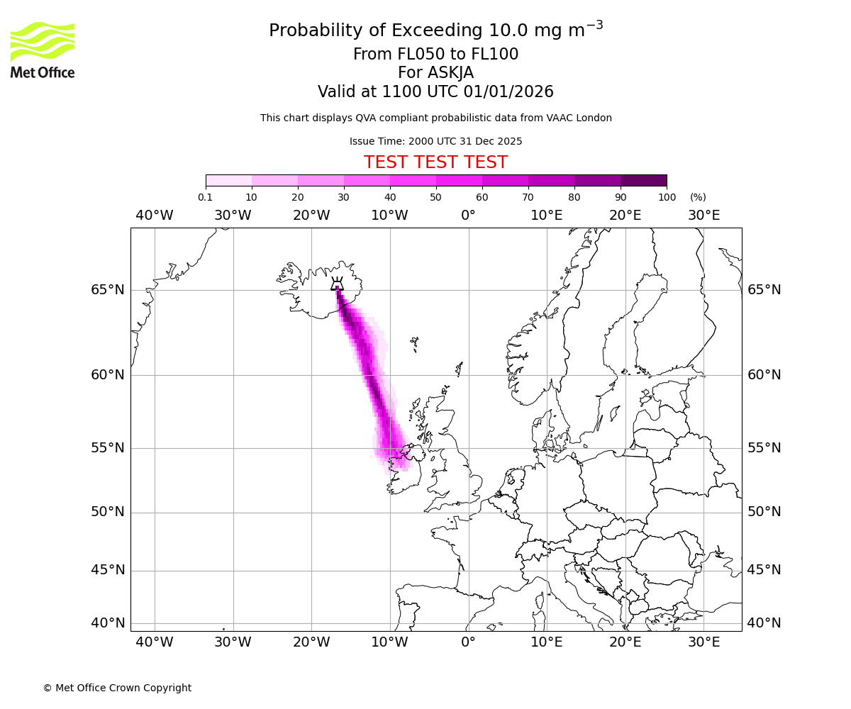 Probability of exceeding 10.0 milligrams per metre cubed. From 000 to 050 for ASKJA. Valid at 1100 UTC 01/01/2026