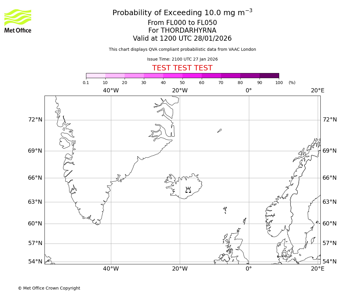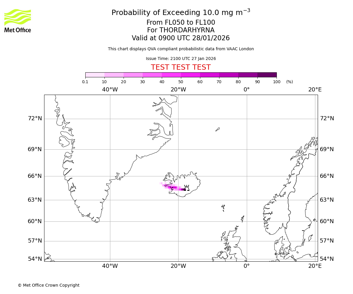 Probability of exceeding 10.0 milligrams per metre cubed. From 000 to 050 for THORDARHYRNA. Valid at 0900 UTC 28/01/2026