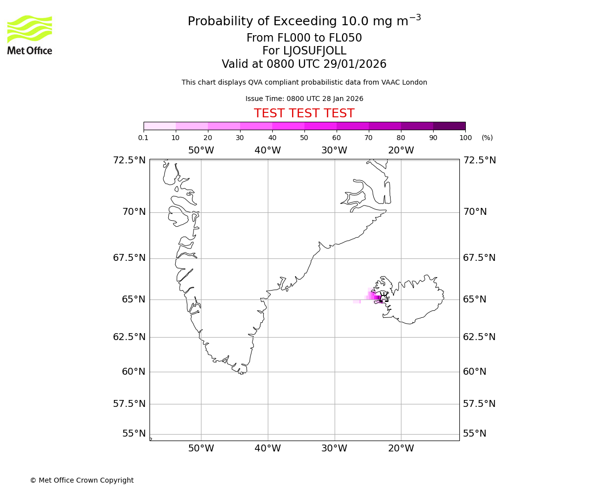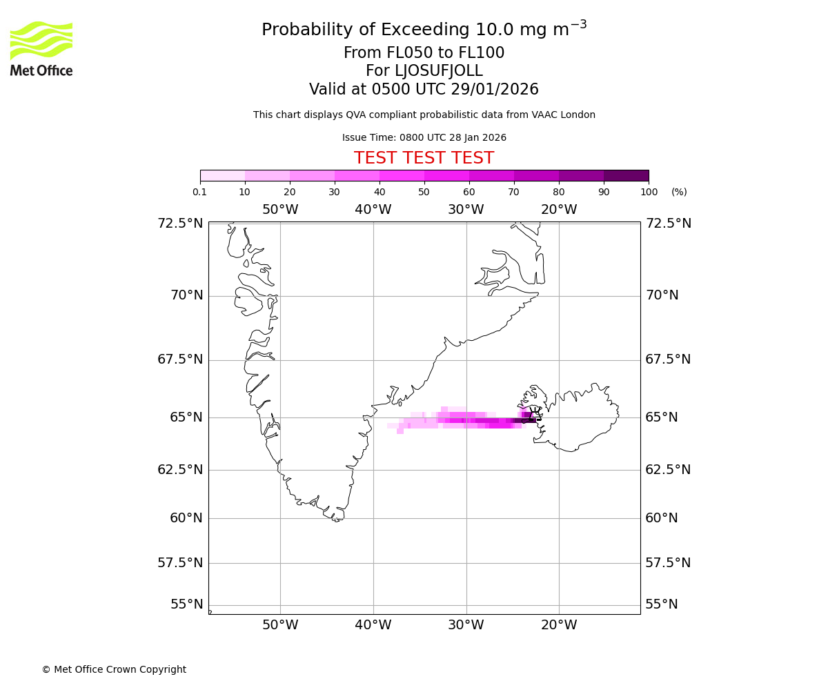 Modelled ash concentration from 000 to 050 for LJOSUFJOLL. Valid at 0800 UTC 28/01/2026