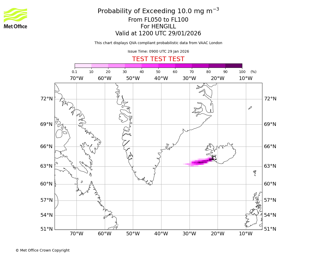 Probability of exceeding 10.0 milligrams per metre cubed. From 000 to 050 for HENGILL. Valid at 1200 UTC 29/01/2026