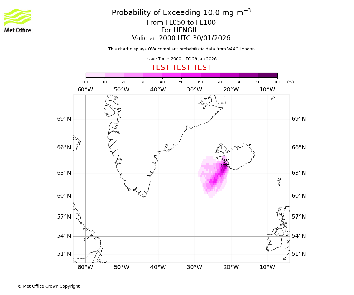 Probability of exceeding 10.0 milligrams per metre cubed. From 000 to 050 for HENGILL. Valid at 2000 UTC 30/01/2026