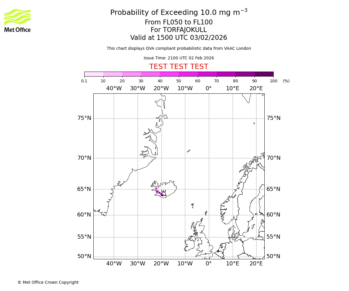 Probability of exceeding 10.0 milligrams per metre cubed. From 000 to 050 for TORFAJOKULL. Valid at 1500 UTC 03/02/2026