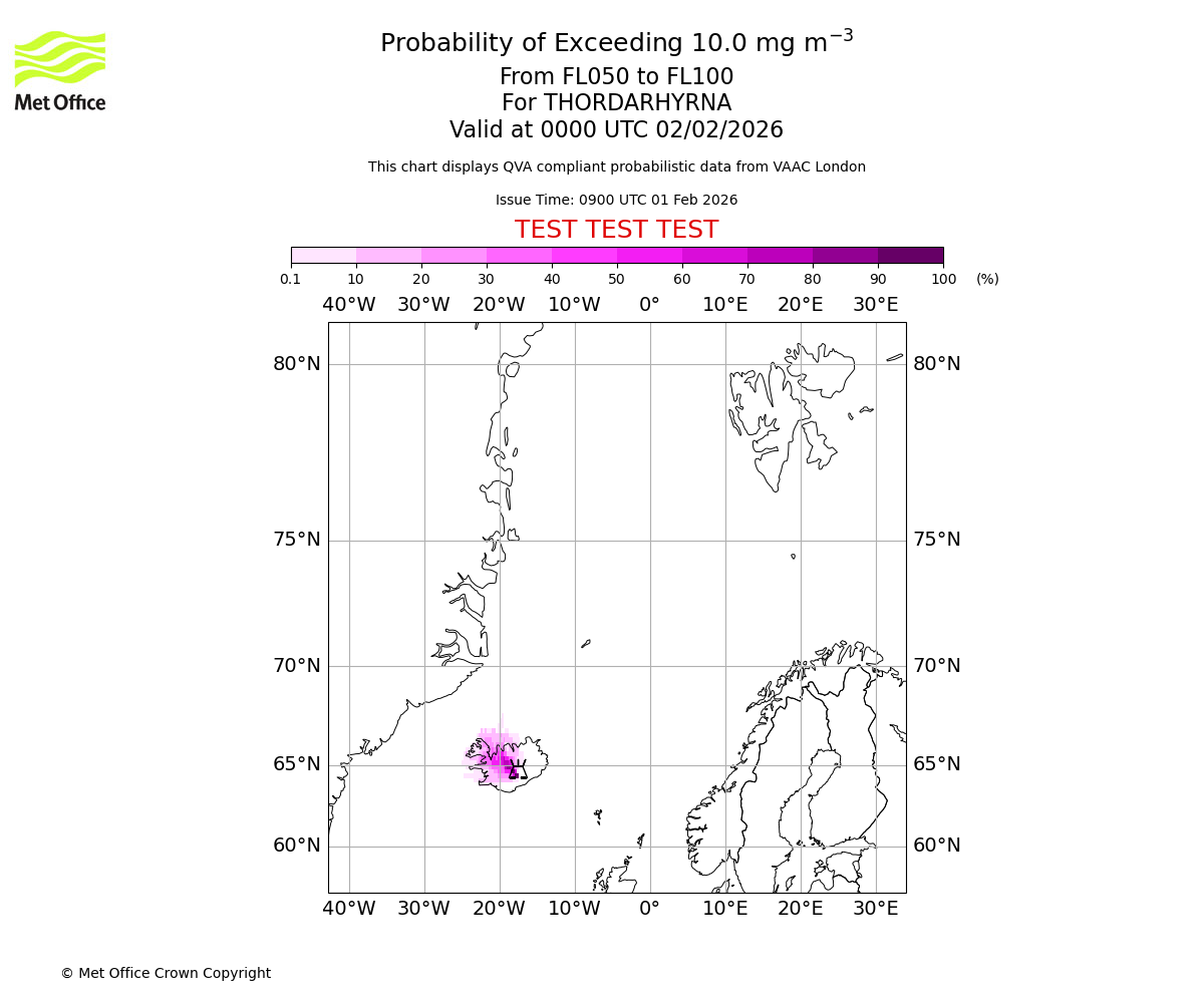 Probability of exceeding 10.0 milligrams per metre cubed. From 000 to 050 for THORDARHYRNA. Valid at 0000 UTC 02/02/2026