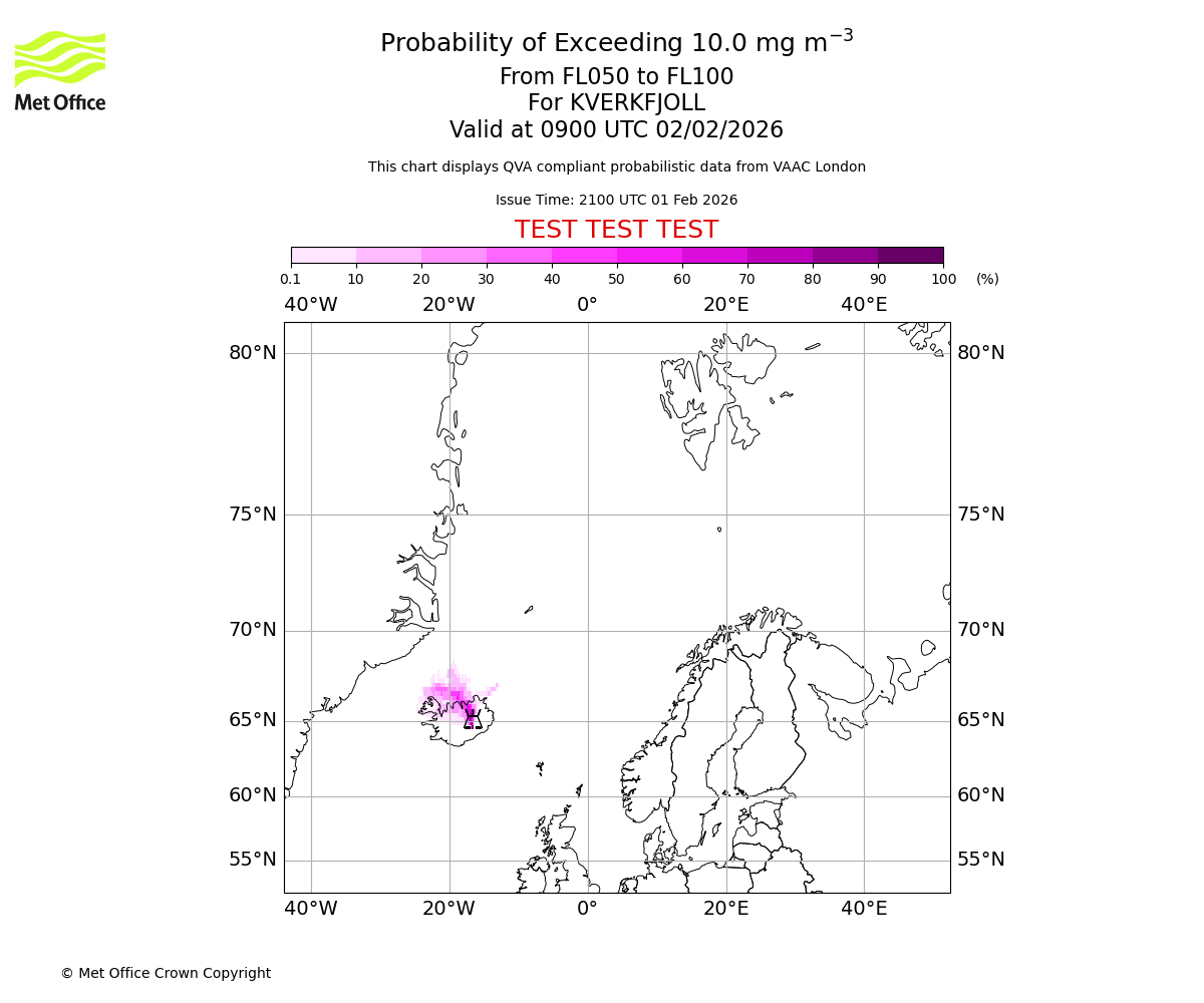 Probability of exceeding 10.0 milligrams per metre cubed. From 000 to 050 for KVERKFJOLL. Valid at 0900 UTC 02/02/2026