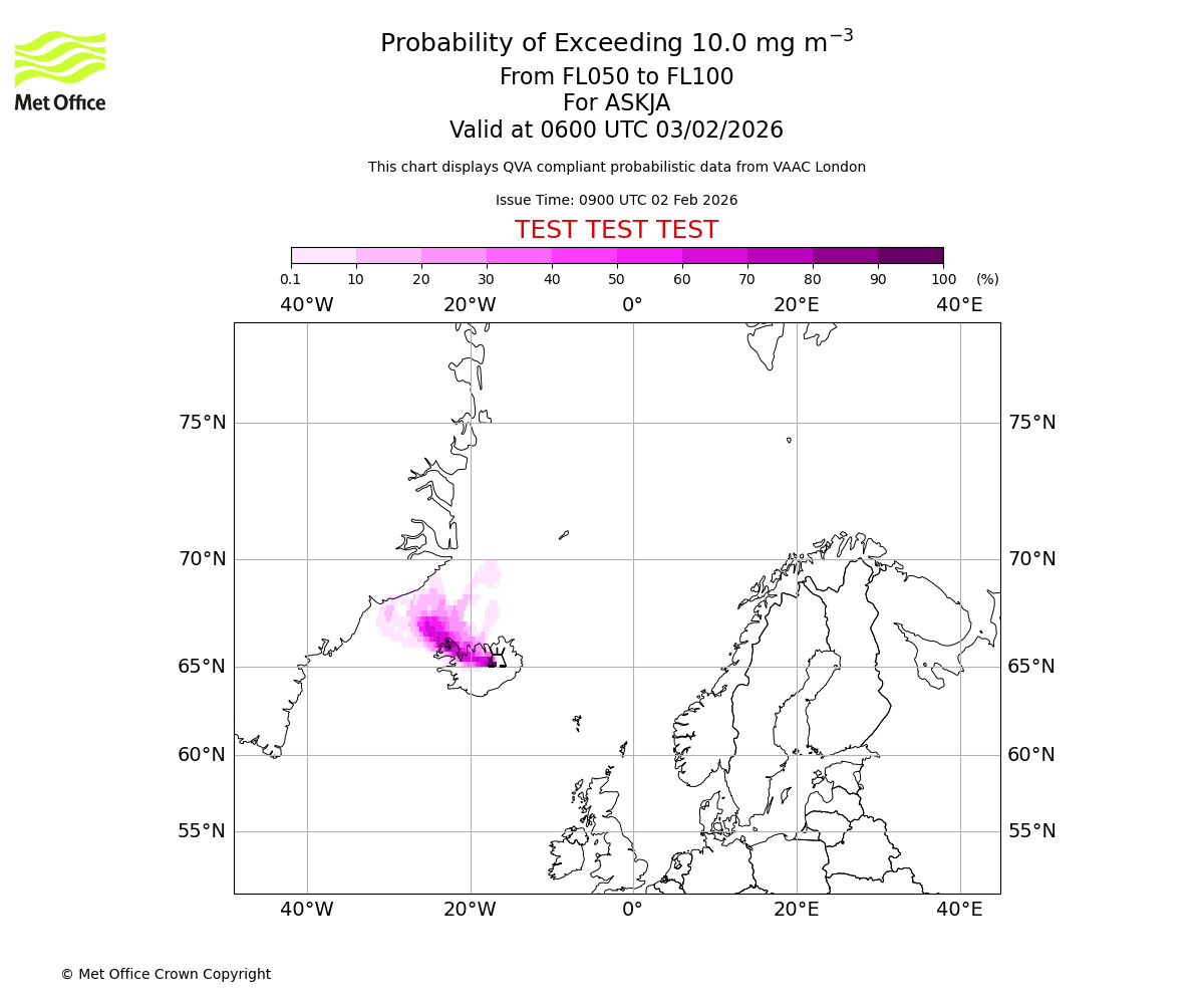 Probability of exceeding 10.0 milligrams per metre cubed. From 000 to 050 for ASKJA. Valid at 0600 UTC 03/02/2026