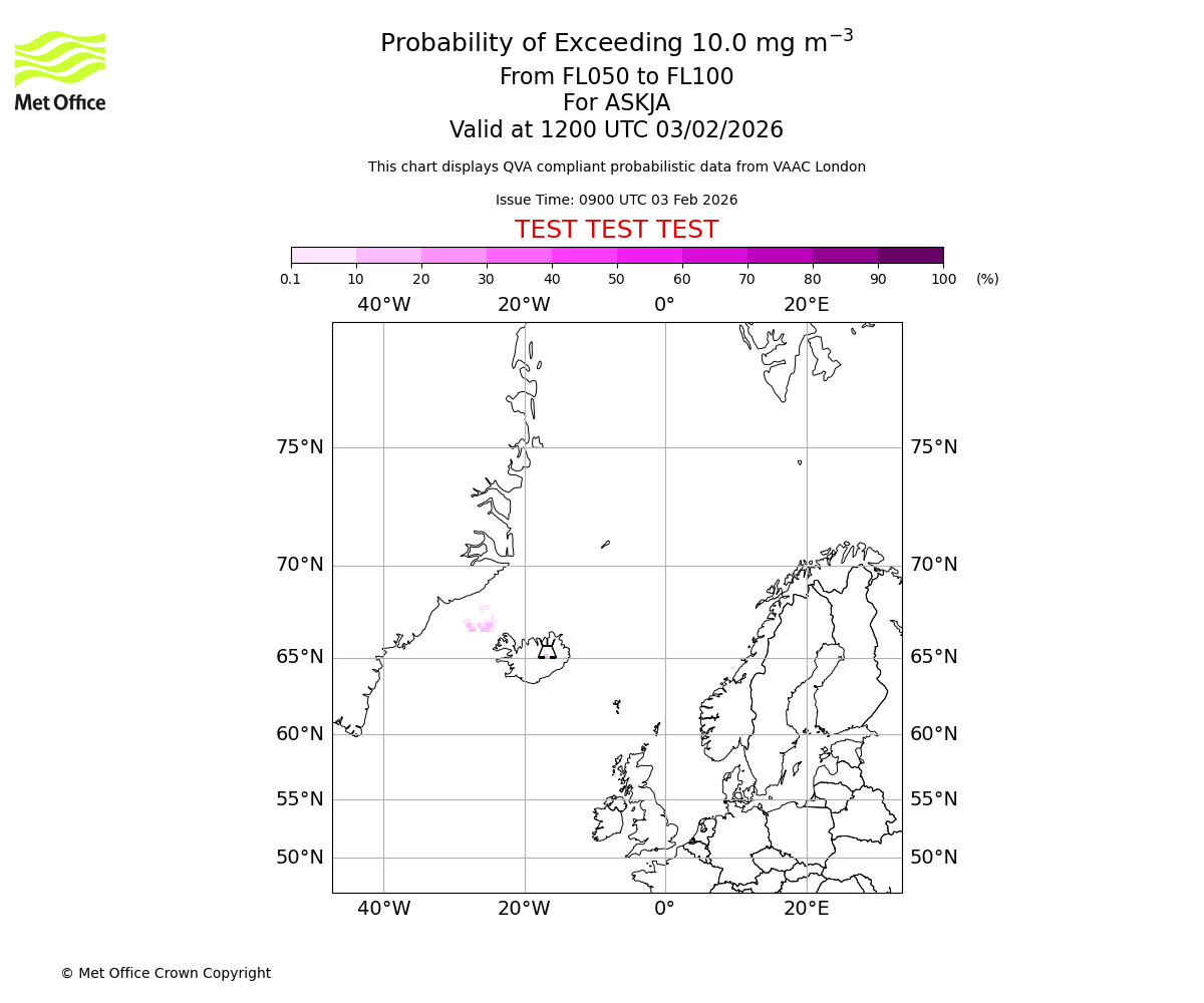 Probability of exceeding 10.0 milligrams per metre cubed. From 000 to 050 for ASKJA. Valid at 1200 UTC 03/02/2026