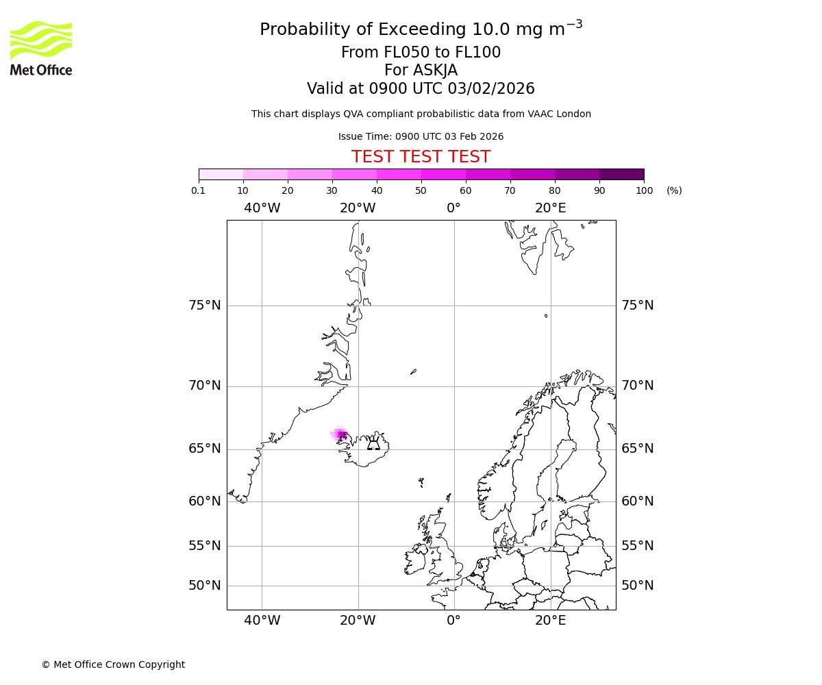 Probability of exceeding 10.0 milligrams per metre cubed. From 000 to 050 for ASKJA. Valid at 0900 UTC 03/02/2026