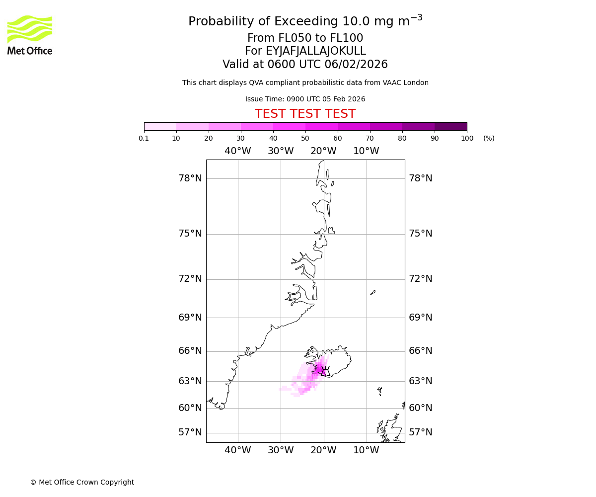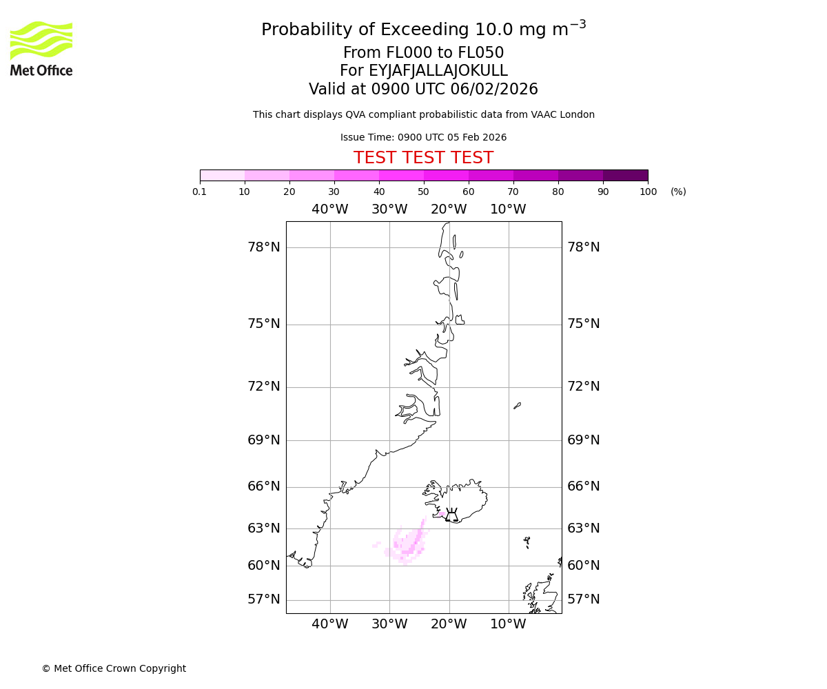 Probability of exceeding 10.0 milligrams per metre cubed. From 000 to 050 for EYJAFJALLAJOKULL. Valid at 0600 UTC 06/02/2026