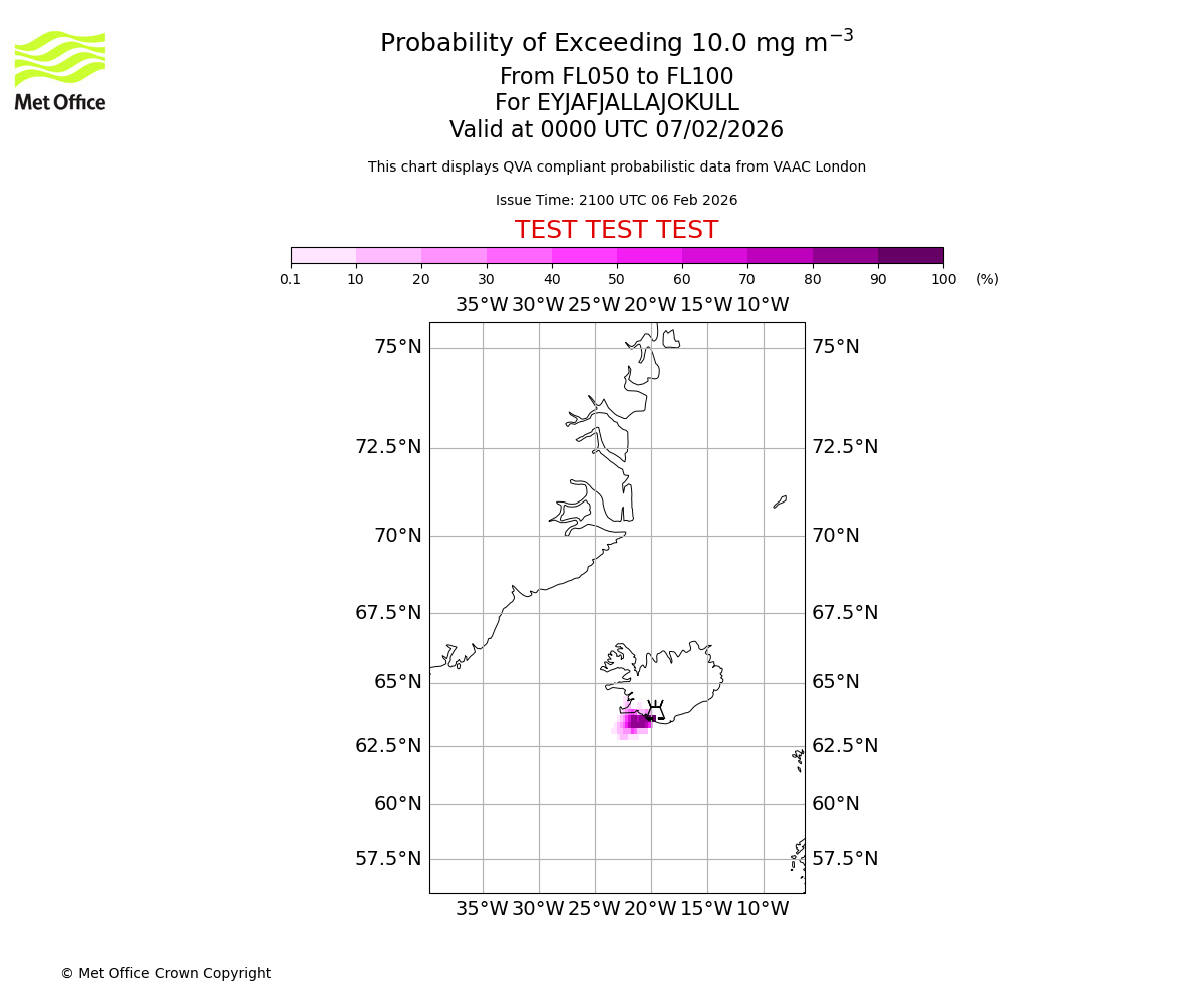 Probability of exceeding 10.0 milligrams per metre cubed. From 000 to 050 for EYJAFJALLAJOKULL. Valid at 0000 UTC 07/02/2026