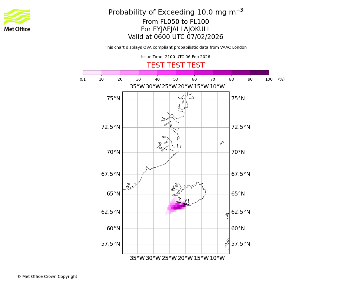 Probability of exceeding 10.0 milligrams per metre cubed. From 000 to 050 for EYJAFJALLAJOKULL. Valid at 0600 UTC 07/02/2026
