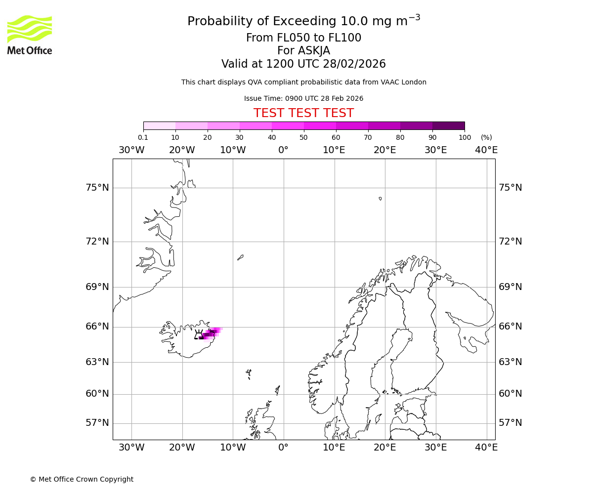 Probability of exceeding 10.0 milligrams per metre cubed. From 000 to 050 for ASKJA. Valid at 1200 UTC 28/02/2026