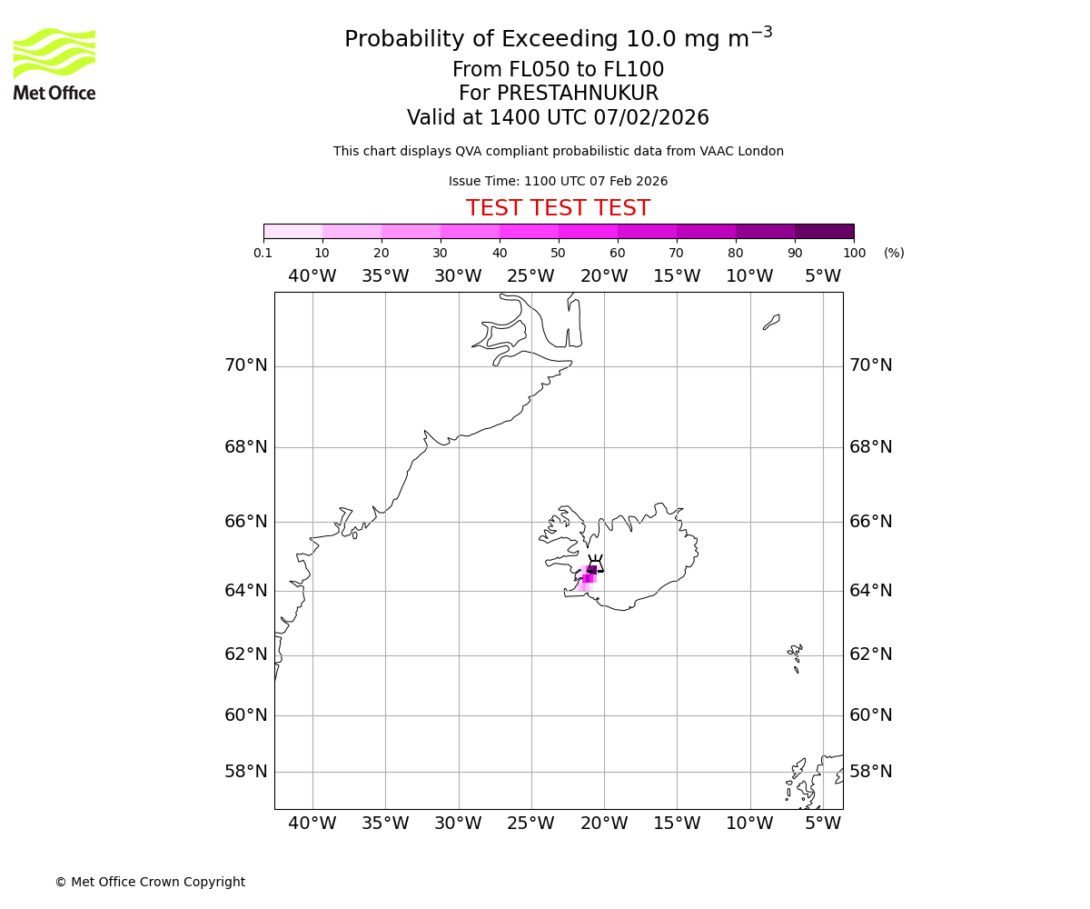 Modelled ash concentration from 000 to 050 for PRESTAHNUKUR. Valid at 1100 UTC 07/02/2026