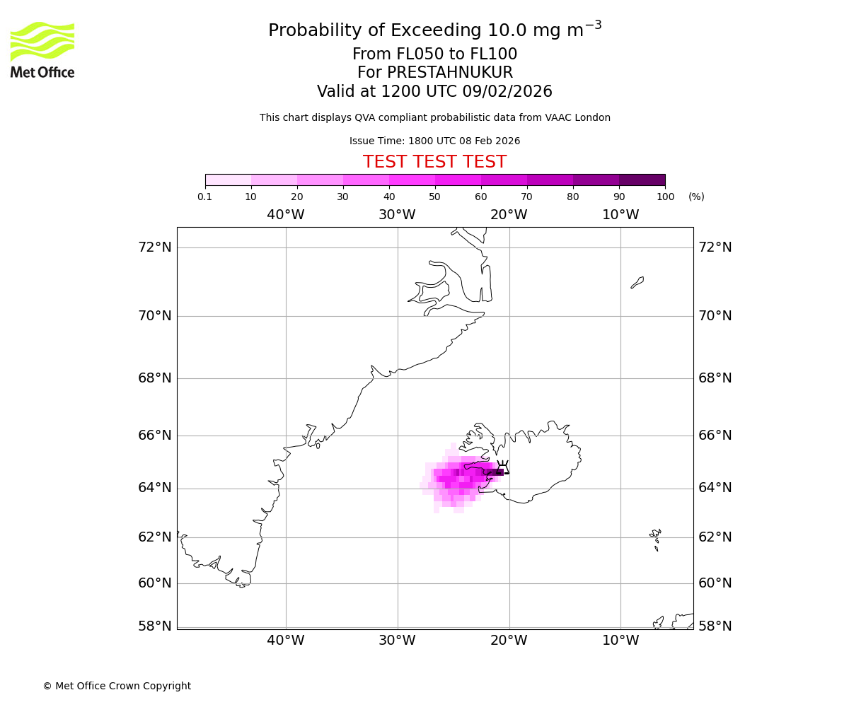 Modelled ash concentration from 000 to 050 for PRESTAHNUKUR. Valid at 1800 UTC 08/02/2026