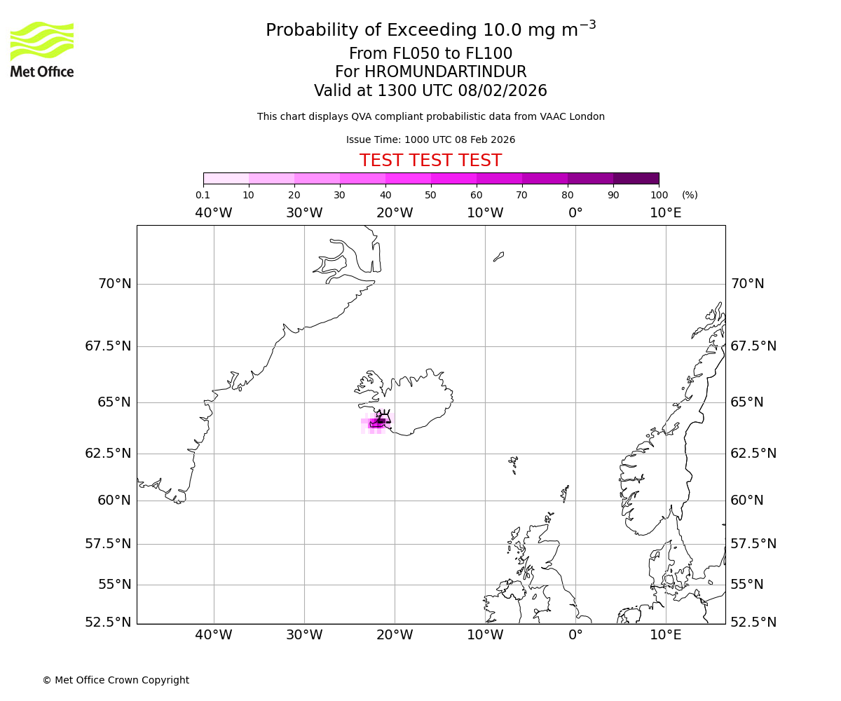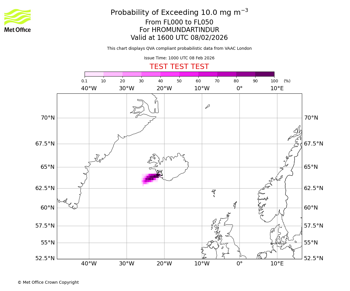 Modelled ash concentration from 000 to 050 for HROMUNDARTINDUR. Valid at 1000 UTC 08/02/2026