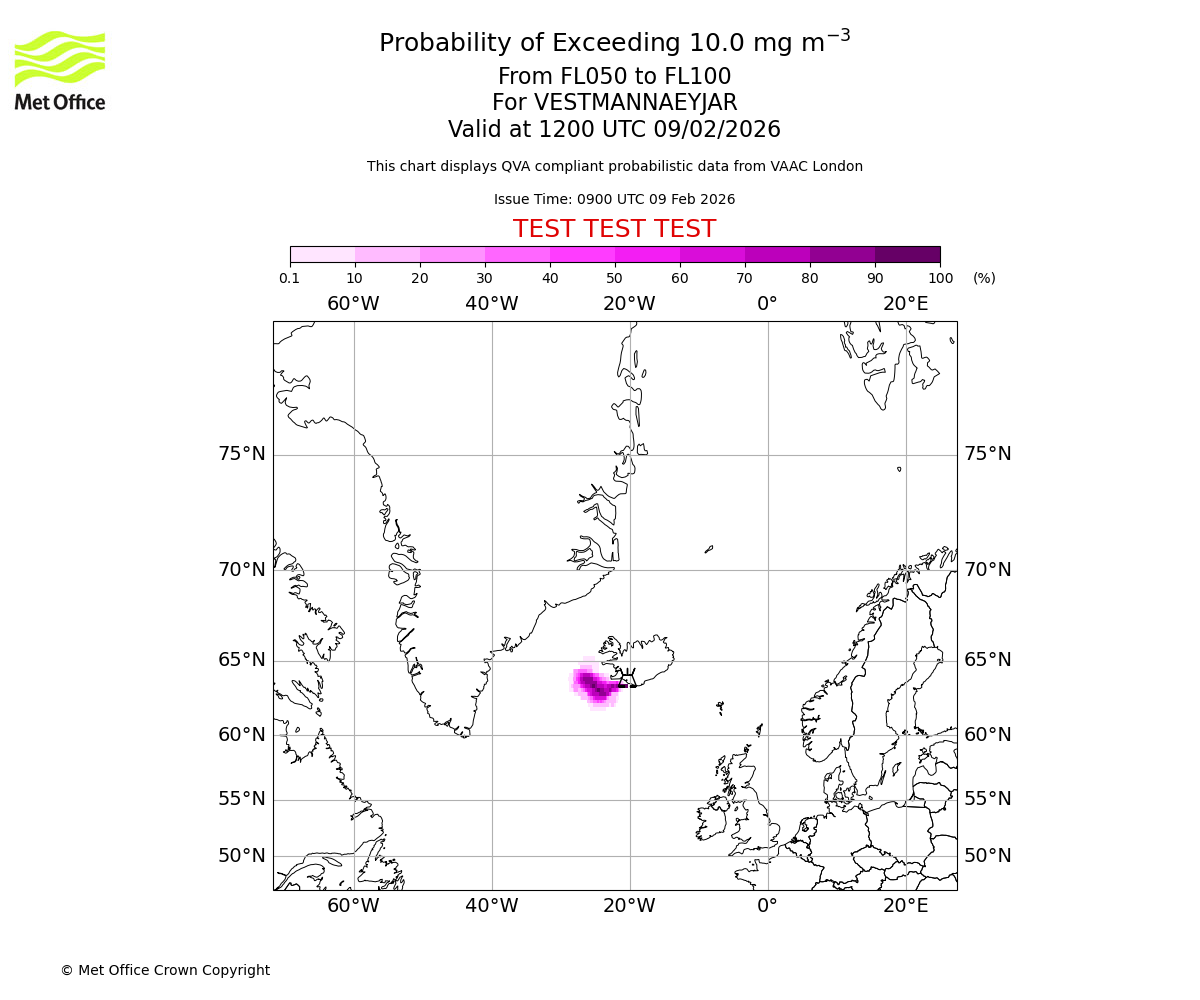 Probability of exceeding 10.0 milligrams per metre cubed. From 000 to 050 for VESTMANNAEYJAR. Valid at 1200 UTC 09/02/2026