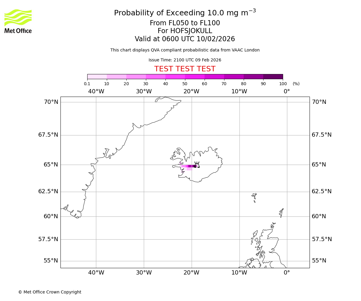 Probability of exceeding 10.0 milligrams per metre cubed. From 000 to 050 for HOFSJOKULL. Valid at 0600 UTC 10/02/2026