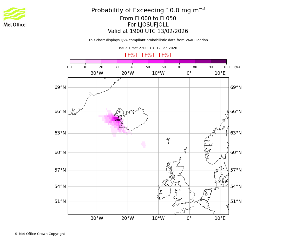 Quantitative Volcanic Ash charts (QVA) are produced in accordance with International Civil Aviation Organization (ICAO) Annex 3 requirements and are provided as well as the London Volcanic Ash Advisory Graphics (VAG) and Advisories (VAA). The lowest QVA threshold (0.2 mg/m³) matches to the areas depicted in the VAA and VAG. Both expected ash concentration and probabilistic forecast information is provided in the chart viewer below for eruptions occurring in the London Volcanic Ash Advisory Centre (VAAC) area of responsibility.