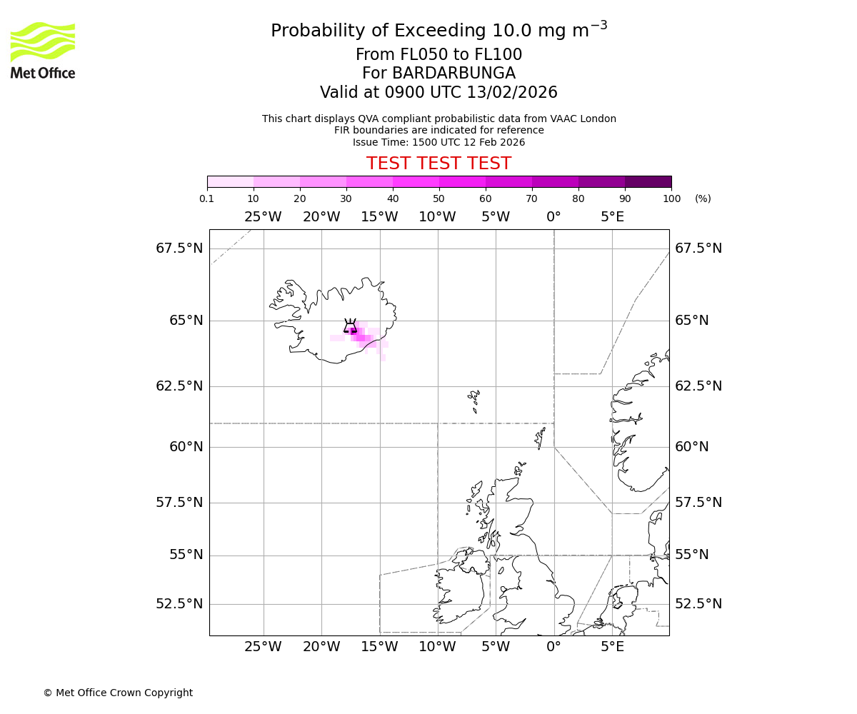 Probability of exceeding 10.0 milligrams per metre cubed. From 000 to 050 for BARDARBUNGA. Valid at 0900 UTC 13/02/2026